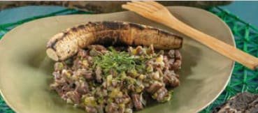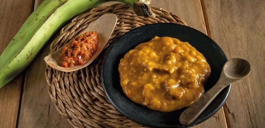 Hacer un refrito con la cebolla, pimiento, ajo, achiote y comino; incorporar la carne previamente picada y sazonada, dejar cocinar por diez minutos; agregar el agua más el plátano pelado y troceado y, cuando esté cocido y blando, retirar y moler/majar. Dejar reducir hasta que se forme una sopa homogénea; finalizar con cilantro y reservar.