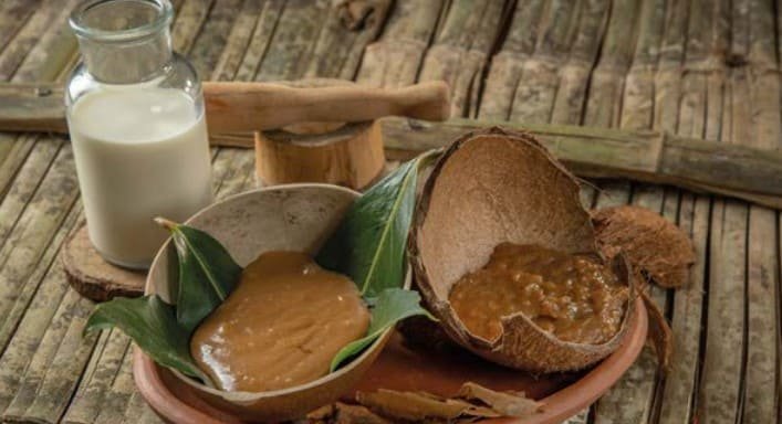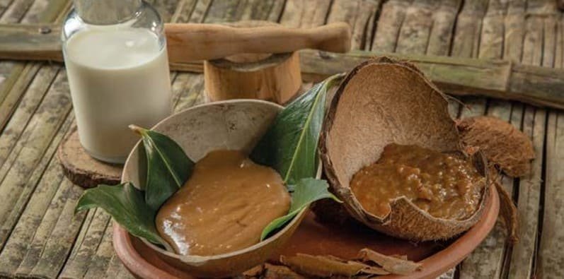 Pelar el coco y raspar su carne. Extraer la leche de coco y reservar. Licuar el bagazo de coco junto con la leche extraída para hacer el zumo. Cernir la mezcla para obtener un líquido homogéneo. En una olla, combinar la leche de coco, el azúcar y la ramita de canela. Llevar a fuego muy bajo, removiendo constantemente para evitar que se pegue. Dejar reducir la mezcla a fuego lento, incorporando el zumo de coco, hasta obtener una textura espesa. Una vez alcanzada la consistencia deseada, retirar del fuego y dejar enfriar el manjar antes de servir.