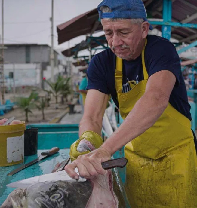 “Pero esta actividad nos sigue enfrentando a la inmensidad y a los peligros del mar”, nos dice Juan Pincay, pescador desde los 12 años en Puerto López. Con 700 u 800 anzuelos, los pescadores se lanzan al mar y pescan corvina y cabezudo.